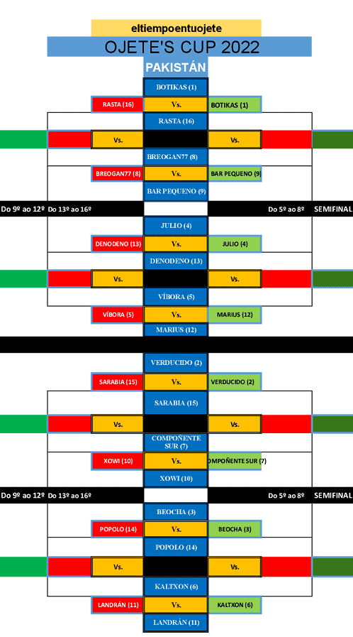 Kaltxon se atopará coa cacheira de serie número 3, Beocha, que marcou a segunda mellor marca en Jhelum con 53 puntos. Compartida con Verducido, que venceu a Sarabia e que se atopará con Compoñente Sur, que eliminou a Xowi sen moito traballo. Sarabia e Xowi pelexarán polo outro lado do cadro. Mesmos 53 puntos para Marius, que tirou de heróica para derrotar ó cacheira de serie número 5, Víbora. Agora terá que seguir na racha para doblegar ó cacheira número 4, Julio, que leva na llama todo o ano. Bateu a Denodeno no seu emparellamento con 52 puntos contra 50. A outra semi sorpresa foi a vitoria de Bar Pequeno sobre Breogán77, ainda que era o 8º contra o 9º. Un só punto derimiu a contenda a favor de Bar Pequeno, que loitará contra o deus da predicción, Botikas, ainda que xa o batíu unha vez e de seguro que Botikas buscará a revancha. Gañou a Rasta con 4 puntos de diferenza sen espeluxarse. Rasta agarda agora por Breogán77.