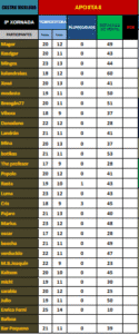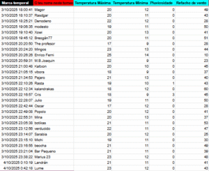 As apostas en temperatura máxima están moi abertas e van dende os 17 ata os 25º C. Os valores para as mínimas oscilan entre 9 e os 14º C., estas tamén con pequenas oscilacións. As precipitacións móvense nun rango de amplitude de entre 0 e 3 litros, pero somentes 2 participantes apostan pola chuvia. Mentras. os refachos de vento van dende os 10 ata os 60 km/h.