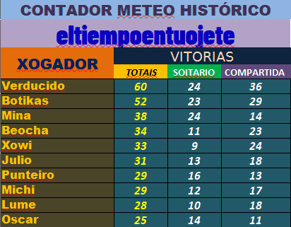 As apostas en temperatura máxima están moi abertas e van dende os 17 ata os 25º C. Os valores para as mínimas oscilan entre 9 e os 14º C., estas tamén con pequenas oscilacións. As precipitacións móvense nun rango de amplitude de entre 0 e 3 litros, pero somentes 2 participantes apostan pola chuvia. Mentras. os refachos de vento van dende os 10 ata os 60 km/h.