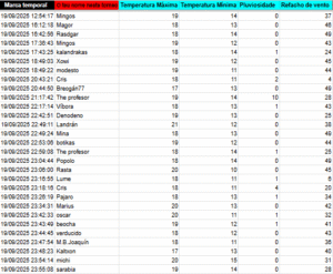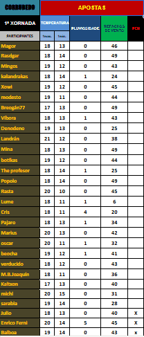 As apostas en temperatura máxima están moi pechadas e van dende os 17 ata os 21º C. Os valores para as mínimas oscilan entre 11 e os 15º C., estas tamén con pequenas oscilacións. As precipitacións móvense nun rango de amplitude de entre 0 e 5 litros, mentras que os refachos de vento van dende os 24 ata os 49 km/h. cunha aposta á baixa de 6 km/h.