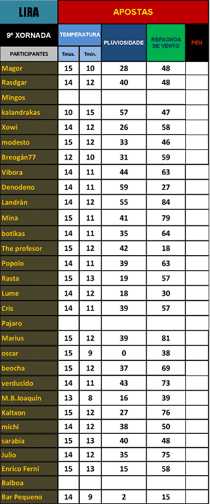 As apostas en temperatura máxima van estar moi pechadas e van dende os 12 ata os 15º C. Os valores para as mínimas oscilan entre 8 e os 13º C., estas de novo con oscilacións medias. As precipitacións é o parámetro máis discutido, con valores que van a seca, 0, ata os 59 litros. Mentras. os refachos de vento van dende os 15 ata os 84km/h., sendo o parámetro máis aberto.