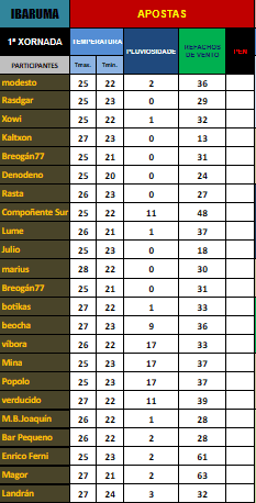 As apostas en temperatura máxima están moi pechadas, indo dende os 25 ata os 28º C. Os valores para as mínimas oscilan entre 20 e os 24º C., estas tamén con diferenzas mínimas. A precipitación é un parámetro con moita marxe, con valores apostados entre os 0 e os 17 litros. Mentras. os refachos de vento van dende os 13 ata os 63 km/h., sendo un parámetro moito máis aberto.