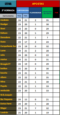 As apostas en temperatura máxima están moi pechadas, indo dende os 22 ata os 25º C. Os valores para as mínimas oscilan entre 15 e os 22º C., estas con máis diferenzas. A precipitación é un parámetro con marxe media, con valores apostados entre os 0 e os 7 litros. Mentras. os refachos de vento van dende os 7 ata os 35 km/h., sendo un parámetro moito máis pechado.