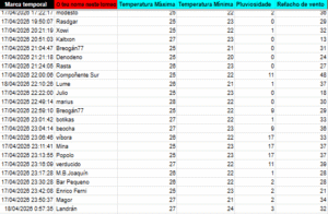 Os datos de precipitación son inamovibles, pero os de temperatura e refacho son medias horarias, polo que poden ser susceptibles de troco no final do día, onde se ofrece unha táboa diarias cos resultados finais destes 2 parámetros. Por conseguinte, a temperatura máxima pode ser superior e a mínima, inferior. Do mesmo xeito, o refacho será un número definitivo superior ó amosado na media.