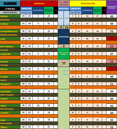 Resultados e clasificacións. Os datos da xornada están estructurados do mesmo xeito que na vella web. En apostas alóxase o horario de recepción de apostas e a távoa da xornada coas apostas ben colocadas. Datos oficiais amosa os datos recollidos por FAWS. As távoas conteñen os resultados da xornada e o seu impacto na clasificación xeral. Fai clic para agrandar as imaxes.