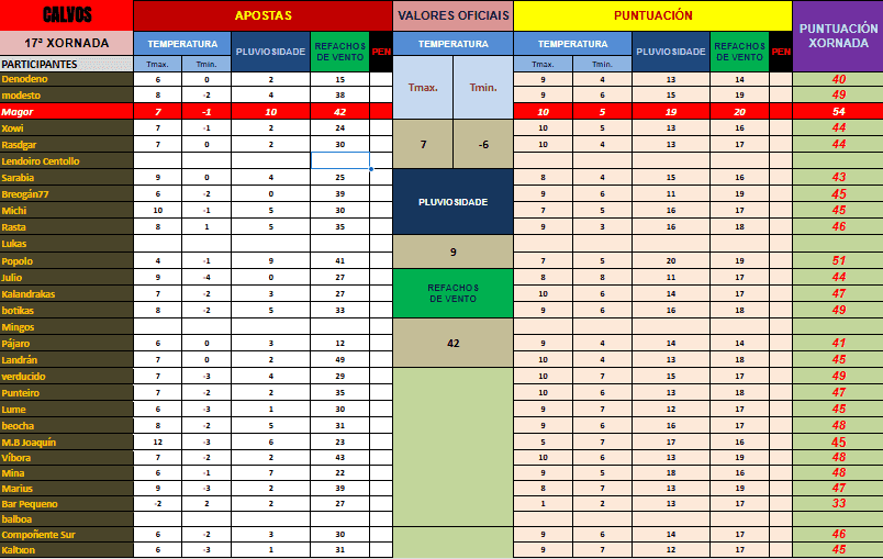 Resultados e clasificacións. Os datos da xornada están estructurados do mesmo xeito que na vella web. En apostas alóxase o horario de recepción de apostas e  a távoa da xornada coas apostas ben colocadas. Datos oficiais amosa os datos recollidos por Meteogalicia. As távoas conteñen os resultados da xornada e o seu impacto na clasificación xeral. Fai clic para agrandar as imaxes.