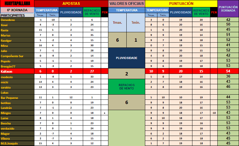 Resultados e clasificacións. Os datos da xornada están estructurados do mesmo xeito que na vella web. En apostas alóxase o horario de recepción de apostas e  a távoa da xornada coas apostas ben colocadas. Datos oficiais amosa os datos recollidos por SENAMHI. As távoas conteñen os resultados da xornada e o seu impacto na clasificación xeral. Fai clic para agrandar as imaxes.