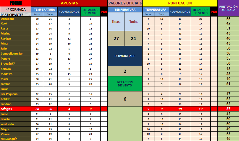 Resultados e clasificacións. Os datos da xornada están estructurados do mesmo xeito que na vella web. En apostas alóxase o horario de recepción de apostas e  a távoa da xornada coas apostas ben colocadas. Datos oficiais amosa os datos recollidos por SENAMHI. As távoas conteñen os resultados da xornada e o seu impacto na clasificación xeral. Fai clic para agrandar as imaxes.