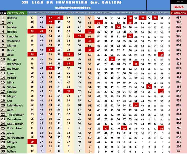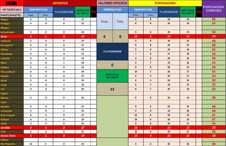 Resultados e clasificacións. Os datos da xornada están estructurados do mesmo xeito que na vella web. En apostas alóxase o horario de recepción de apostas e  a távoa da xornada coas apostas ben colocadas. Datos oficiais amosa os datos recollidos por Meteogalicia. As távoas conteñen os resultados da xornada e o seu impacto na clasificación xeral. Fai clic para agrandar as imaxes.