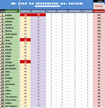 Dende eiquí podes facer un seguimento da Clasificación Xeral da XII Liga da Inverneira en cada unha das etapas. Pica nas fotos para agrandar a imaxe.