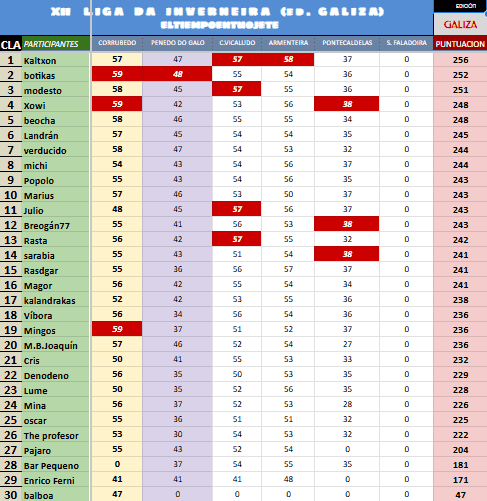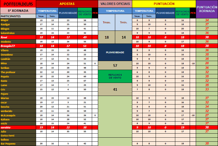 Resultados e clasificacións. Os datos da xornada están estructurados do mesmo xeito que na vella web. En apostas alóxase o horario de recepción de apostas e  a távoa da xornada coas apostas ben colocadas. Datos oficiais amosa os datos recollidos por Meteogalicia. As távoas conteñen os resultados da xornada e o seu impacto na clasificación xeral. Fai clic para agrandar as imaxes.