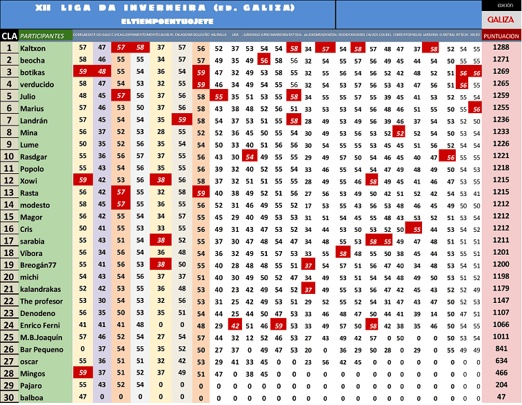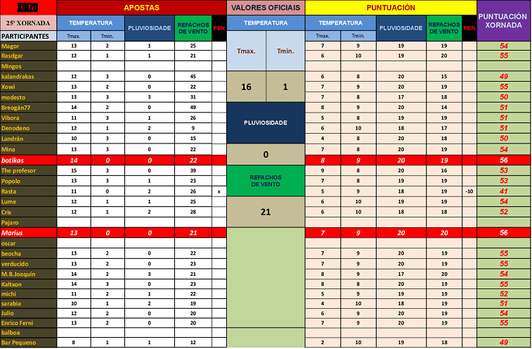 Resultados e clasificacións. Os datos da xornada están estructurados do mesmo xeito que na vella web. En apostas alóxase o horario de recepción de apostas e  a távoa da xornada coas apostas ben colocadas. Datos oficiais amosa os datos recollidos por Meteogalicia. As távoas conteñen os resultados da xornada e o seu impacto na clasificación xeral. Fai clic para agrandar as imaxes.