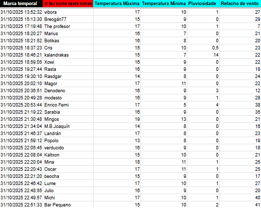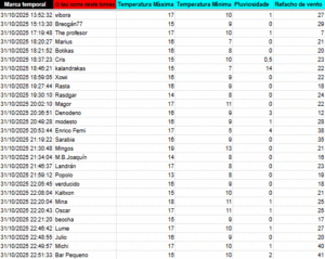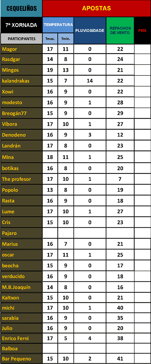 As apostas en temperatura máxima volven estar moi abertas e van dende os 13 ata os 19º C. Os valores para as mínimas oscilan entre 5 e os 13º C., estas de novo con grandes oscilacións. As precipitacións é o parámetro menos discutido, con valores que van dende unha gran maioría de seca, 0, ata os 4 litros, cunha aposta forte de 14 litros. Mentras. os refachos de vento van dende os 7 ata os 41 km/h., sendo un parámetro tamén moi aberto.