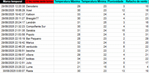 As apostas en temperatura máxima están moi abertas e van dende os 28 ata os 34º C. Os valores para as mínimas oscilan entre 22 e os 25º C., estas cunha pequena oscilación. As precipitacións móvense nun rango de amplitude de entre 0 e 15 litros, mentras que os refachos de vento van dende os 10 ata os 31 km/h.