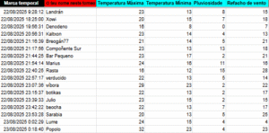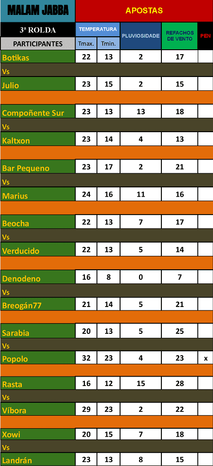 As apostas en temperatura máxima están moi abertas e van dende os 16 ata os 32º C., sendo o groso de apostas entre os 24 e os 20º C. Os valores para as mínimas oscilan entre 8 e os 23º C., estas tamén cunha grande oscilación. As precipitacións móvense nun rango de amplitude de entre 0 e 15 litros, mentras que os refachos de vento van dende os 7 ata os 28 km/h.