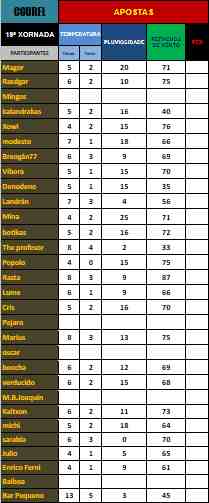 A 19ª xornada da Liga da Inverneira vai cara o sureste de Lugo, nun dos parques naturais máis belos da xeografía galega. O Courel é unha das zonas máis chuviosas da provincia e pode dar xogo nesta edición da competición. E a tenor das apostas realizadas semella que haberá trocos, ainda non se sabe se grandes ou pequenos na configuración das posicións actuais. A efectos das prediccións oficiais vai ser unha xornada de frio moderado, con chuvia en calquera dos casos e con ventos medios fortes, o que fai que haxa unha mistura de incógnitas moi ampla. Veremos se vai ser tan atrapallada como aparenta…