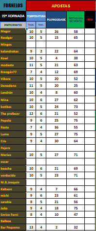 As apostas en temperatura máxima están abertas, indo dende os 7 ata os 13º C. Os valores para as mínimas oscilan entre 4 e os 6º C., estas de novo con oscilacións menudas, ainda que cunha aposta á baixa de 2º C.. A precipitación é un moi parámetro especialmente discutido, con valores dende ata os 36 litros. Mentras. os refachos de vento van dende os 25 ata os 75 km/h., sendo un parámetro moi aberto tamén.