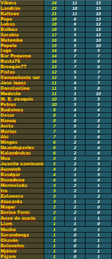 3 argallantes sumaron 57 puntos. Magor, no seu segundo ano de competición está a amosar gran calidade e trepa ata esa 2ª praza compartida facendo tremer a moit@s meteoludópatas de competencia contrastada. Poderá aguantar o ritmo? Julio, despois dun gran varapau na 2ª xornada semella recuperado nestas derradeiras duas xornadas e xa conparte a 11ª praza disposto a ingresar no Top-10. Será este o seu ano máxico? O que xa ostenta esa praza entre os 10 mellores é Marius, outro que leva tempo metendo medo sen final feliz. Pode ser merecedor da coroa? Estes tres xogadores son do máis prometedor deste ano…